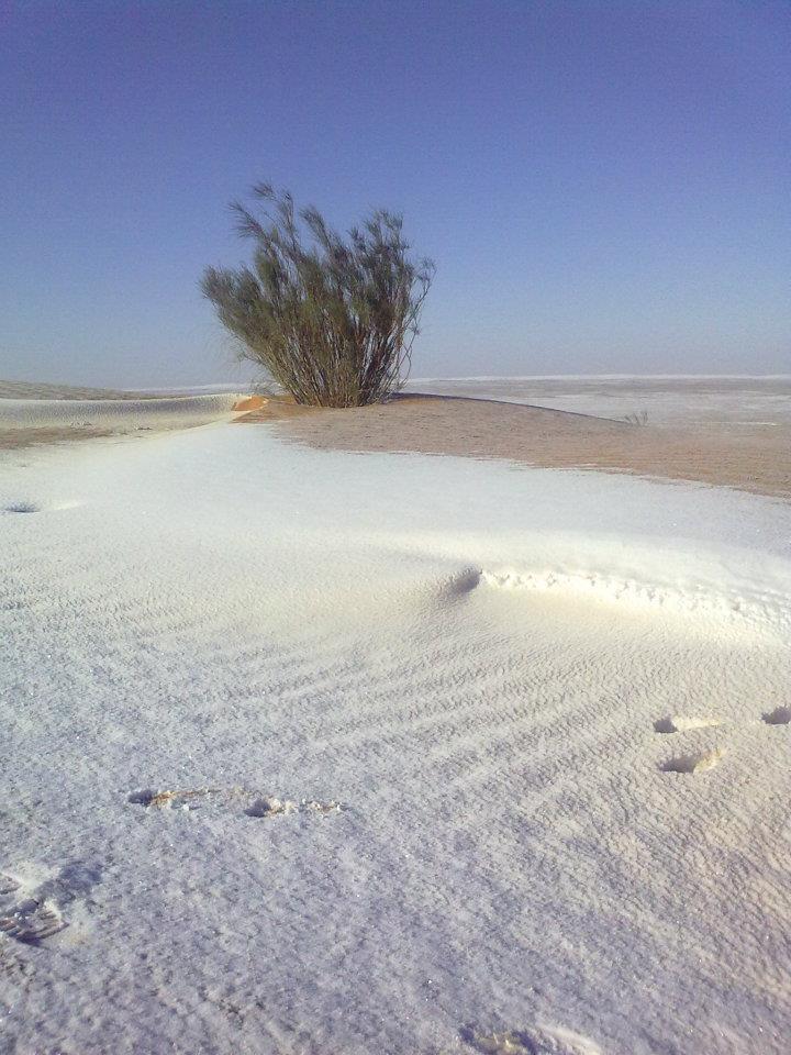 Ce n’est pas seulement en Algérie qu’on voit la neige au Sahara, mais aussi en Tunisie. Un phénomène bien rare, mais cette vague de froid qui a touché notre pays ce dernier Weekend a bel bien aussi touché le Sahara au Sud Tunisien, même les habitants de Nefta se sont retrouvés avec une couche blanche qui avait couvert les dunes jaunes d’habitudes.