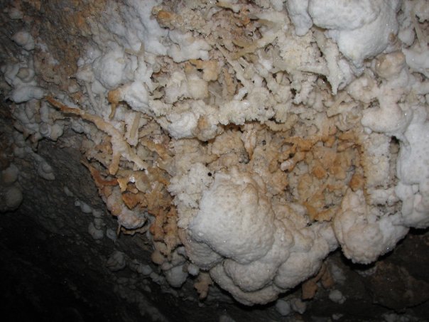 Après avoir parcouru des dizaines de mètres dans le labyrinthe de cette ancienne mine nous étions arrivés à un trou, qui est en faite la première descente d’un total de 3, respectivement de 40, 30 et 10 mètres de profondeurs. Une fois tout en bas, nous avions tous été ébahis par la splendeur et la grandeur de ce qu’on voyait. La grande salle est la partie la plus spectaculaire de la grotte, de 150 mètres de longueur, de 267 mètres de largeur et d’une voûte qui dépasse les 30m du sol par endroit. Les lumières de nos lampes étaient reflétées par de très belles concrétions un peu partout dans la salle, par des stalactites, des colonnes et de belles stalagmites dont l’une atteint les 8 mètres d’hauteur. Nous avons trouvé aussi des bassins d’eau, et deux espèces de chauves souris habitant cette salle. Cette grotte a eu le titre de la plus grande dans la région de l’Afrique du nord, par contre le titre de la plus belle grotte revient à celle de Ain Dhab qui se situe à seulement 10 kilomètres de celle la et qui a été découverte au mois de décembre 2009, ce titre n’est que grâce à ses fistuleuses, ses perles et son lac sous terrain de 3 kilomètres.(elle a été découverte exactement en 1981, par Patrice Pierret et André Roy qui ont réussi a atteindre les 3000m de profondeur de la grotte, mais la visite en entier par une equipe 100% tunisienne n’a eu lieu que le 1er janvier 2010 par le groupe de Spéléologie de Zaghouan.