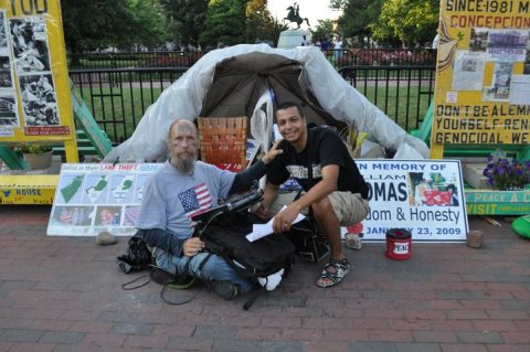 Curieux j’étais parti lui parlé, il n’a pas de nom, il m’a dit qu’il s’appelle « Start Loving« , et ce dernier n’est que l’un des rares militants de la paix les plus reconnues à Washington DC. Start Loving avait rejoint le Sit In depuis 2009 pour remplacer son « frère » William Thomas qui protestait non stop depuis 1981 dans le parc Lafayette, en face de la Maison Blanche, décédé en cette même année.